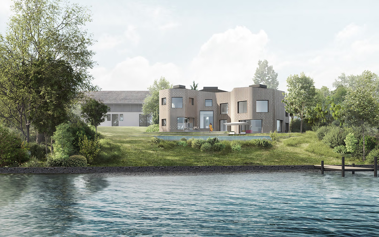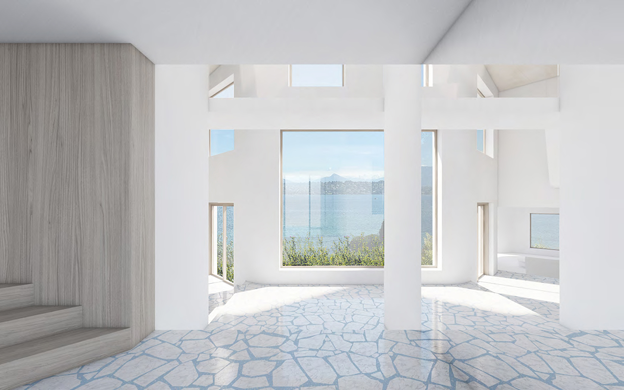 An analysis of the evolution of the shores of the Leman Lake leads us to reconsider the vil-la’s integration as vital to the landscape. The uppermost area of the site, comprising a 19th century annex, will communicate with the access road, creating a private square that over-looks the landscaped patio of the house. The house will therefore embrace a new organic language with gentle curves layout and topographic roof profile.