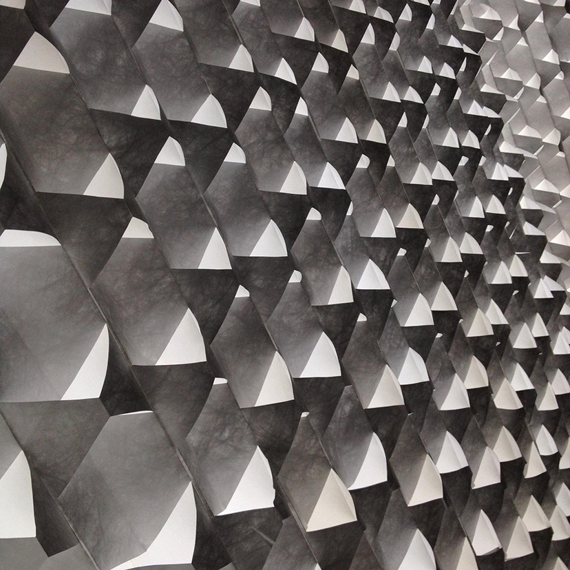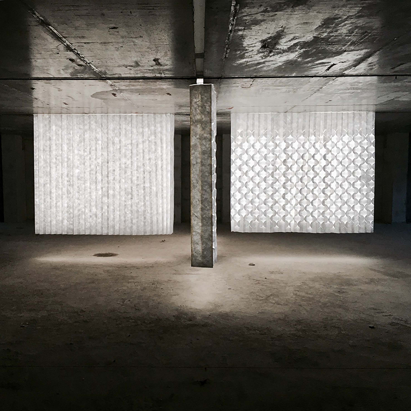 Concrete Paper must be understood in its state of ongoing thematic research. Each element presented here is paradoxically weightless yet solid as the materiality of the paper is challenged & reinforced by folding techniques. These works are mobile rather than static, easily adjustable in length and adjacency allowing for objective altered perspectives. The installation featured a frame-by-frame narrative sequence through a progression from 1st to 4th floor. As one navigated through the work individual experiences permitted a variety of interpretations of scale.
