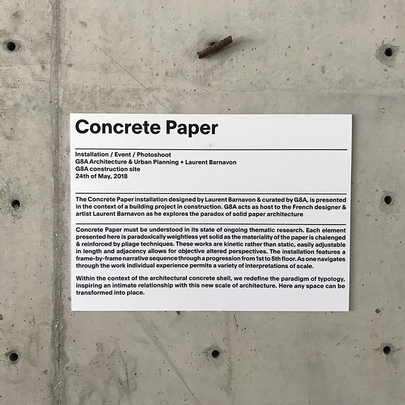 The Concrete Paper installation designed by Laurent Barnavon & curated by G8A, was presented in the context of a building project under construction. G8A acts as host to the French artist Laurent Barnavon as he explores the paradox of solid paper architecture.