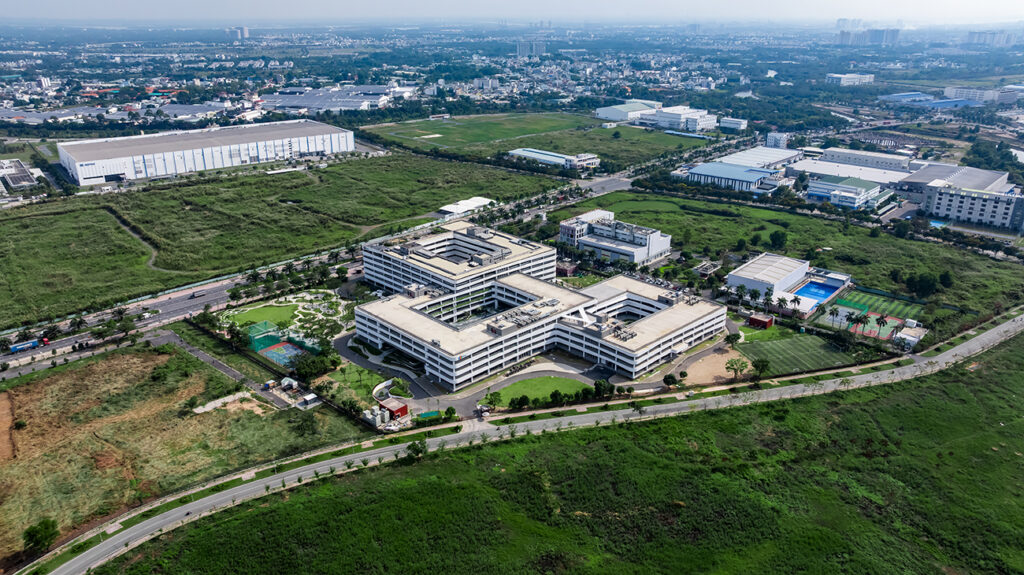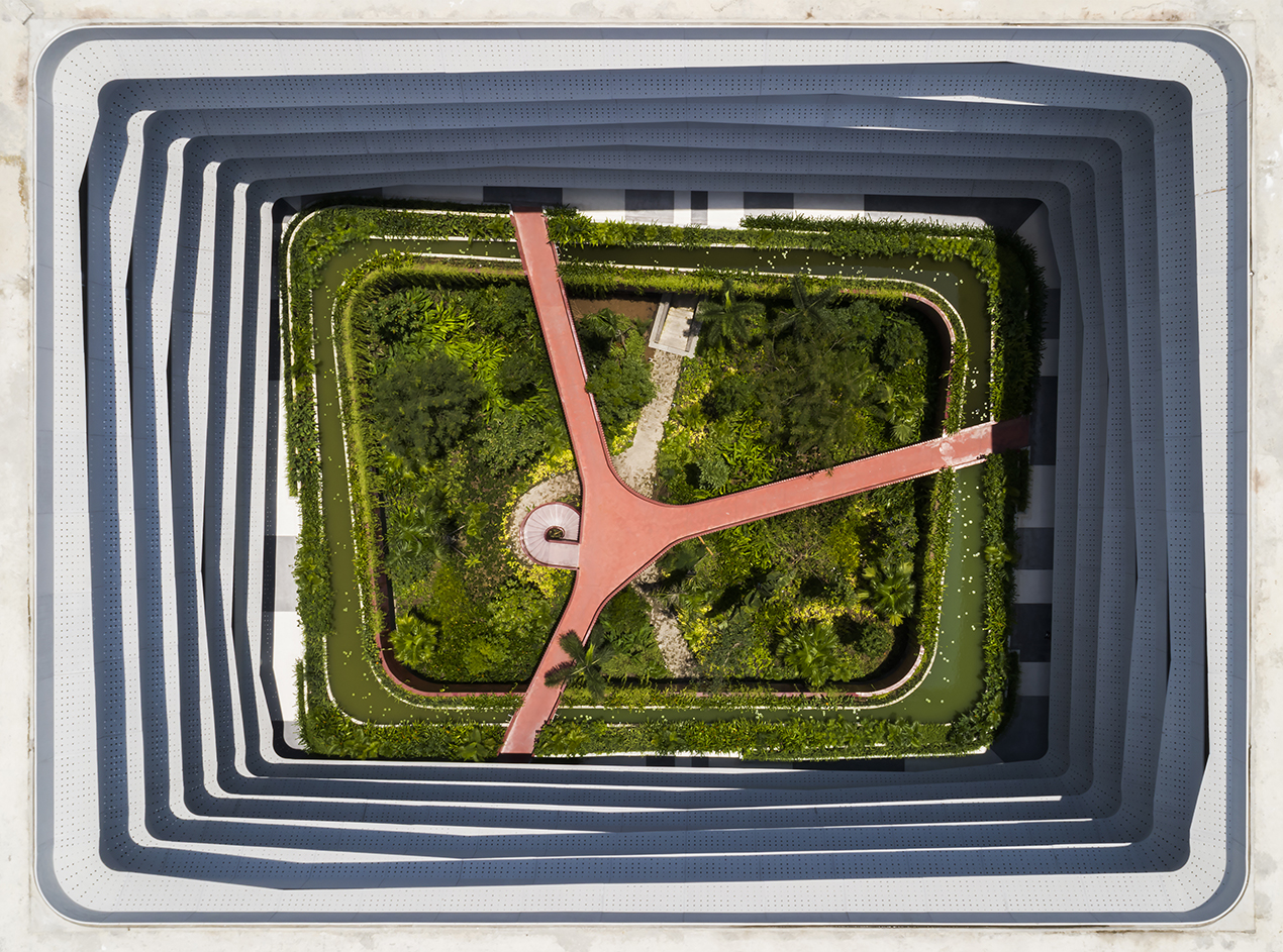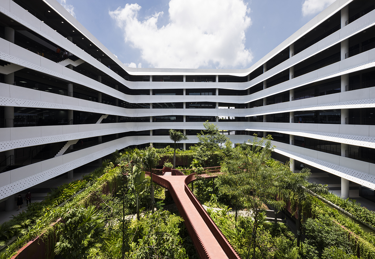 Landscape elements such as; fencing, signage, and parapet walls around the yard are made from red Corten Steel. The building’s use of colour and material sets it apart from other developments within the vast masterplan. Marked by the high contrast between the mono chromatic skin of the building that is in light, medium and dark grey, and the stunning lush vegetation the building is iconic.