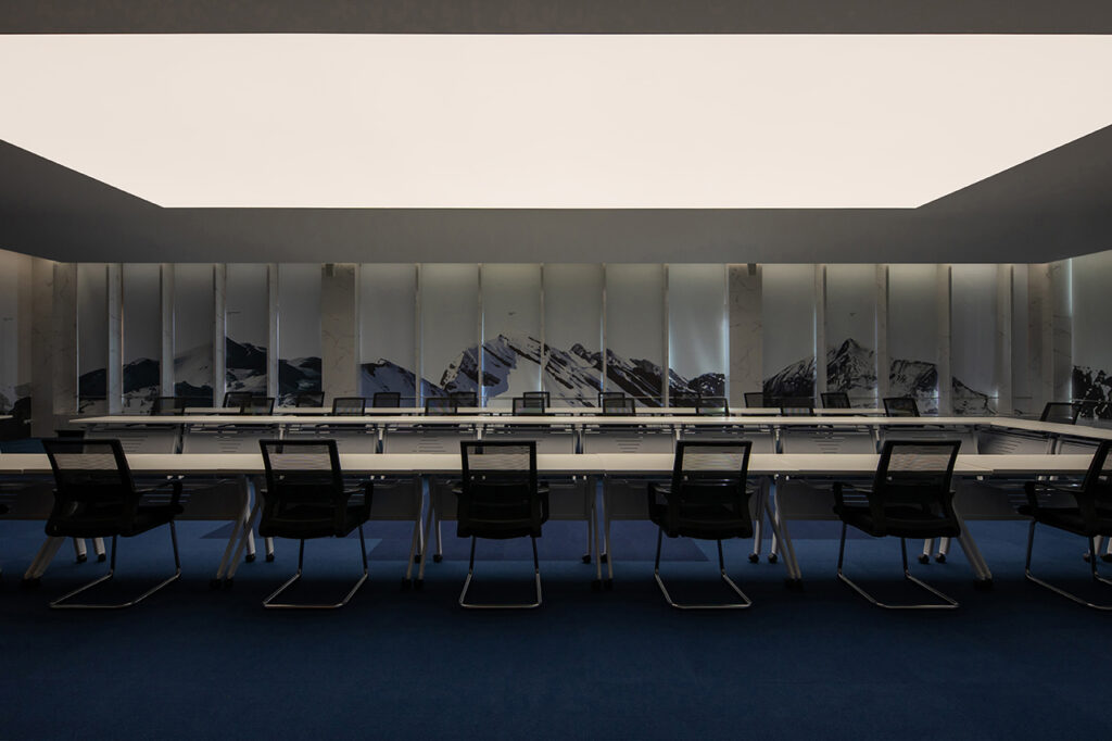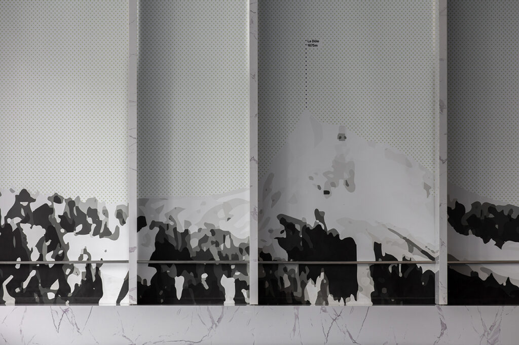 The designed space of 250m2 is intended to house up to 100 people, attendees of presentations, educational workshop and events. The crisp color scheme, homogenous lighting and use of smooth stone is reminiscent of frosty alpine winters, transporting the user straight to Geneva. The Alps’ mountainscape replicated on the panoramic bay windows are adjusted in order to replicate the 360 view one would experience if standing on the South edge of Switzerland’s most symbolic lake. Depictions of Le Crozat, Mont Tendre, Grand Cret and of course Mont Blanc to the East conceptually unite and immerse the viewers.
