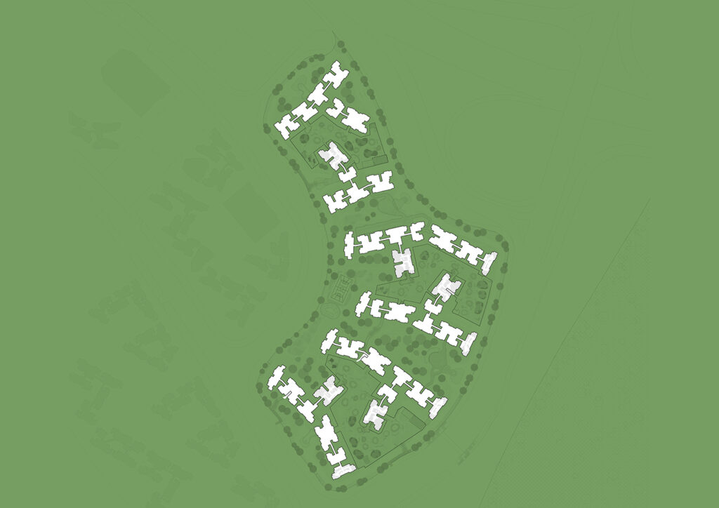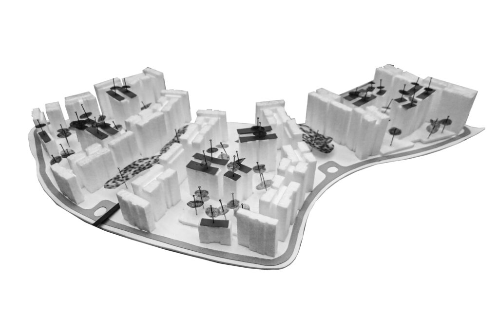 Here, the urban strategy is to introduce organisms that adapt to different conditions. The “branch typology” composed of a range of unit types adapts to orientation and views. The “urban yoga” exercise branches respond to context whilst generating spaces of interest between themselves. The heart of the project lies in the arrangement of three pairs of branches with elevated residential green environmental decks, complimented by two valleys of trees planted on true ground.