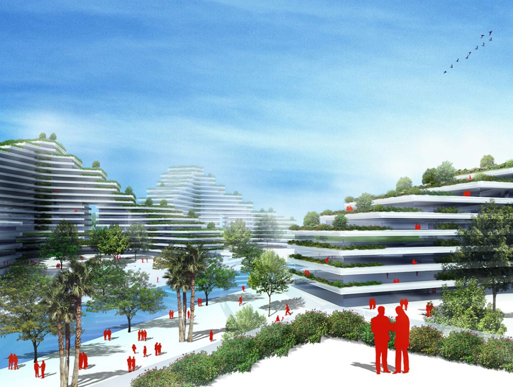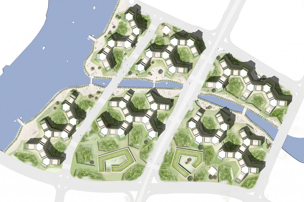 Seeking to establish a strong relationship between the buildings and the edges of the waterway, the unique 1200 layout of the buildings as well as the cascading skyline created by the landscaped terraces of the roofs, serves to accentuate this connection. .