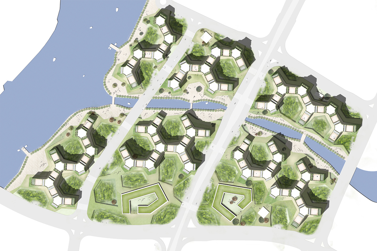 Hexagonal voids, cut into the courtyard spaces, further strengthen the dialogue between the residences and the canal banks while bringing elements of the landscape into the public realm. Landscape elements feature strongly throughout the scheme, reinforcing the concept of living in a verdant urban oasis. .