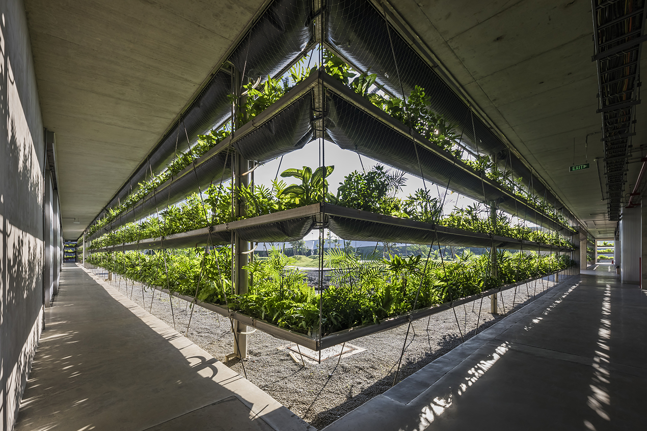 two-layer rope network stretched from the ground to the roof. The horizontal geotextile planters not only filter rain and sun, but also contribute to lowering the atmospheric temperature through evaporation, acting as air purifiers and dust particle binders.