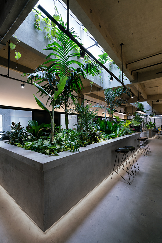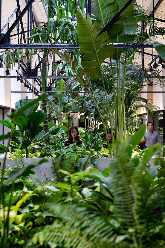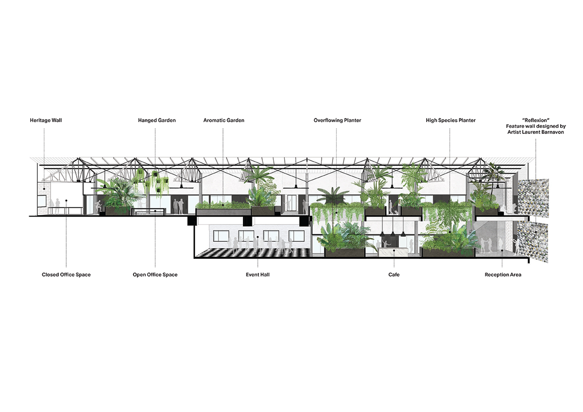 The conception of a tropical environment that also facilitates the flow between the various programs is possible via the feature element of the “Green Connector”. The vegetal spine runs centrally through the space both horizontally and vertically remaining visible from any public zone of the building. More than a simple combination of potted plants, the cooling and calming capacities of the Green Connector occupies all echelons of the space, from large succulents to hanging creepers and an aromatic herb garden. This green connector also plays the role of “social connector” as traffic allows itself to pause among the foliage. With resting and working stations dotted along the central plantations, the specialized coffee bar caters for a relaxed break.