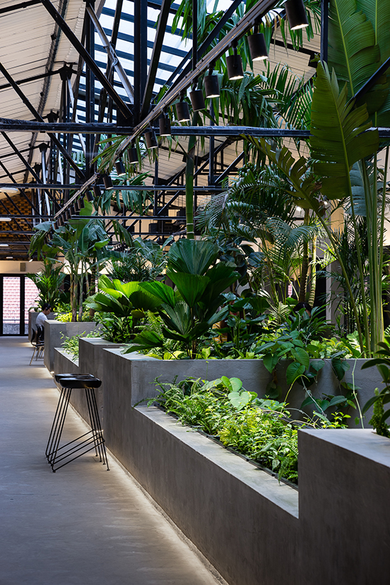 To allow for focus and highlight the presence of the green organic volumes, architectural elements are left raw, minimal and monochromatic. Here a balance is created by reintroducing traces of the structure’s industrial past, revealing operational and technical elements of the building such as support beams, ventilation systems and cabling. Details of industrial character; exposed textured brick and dark.