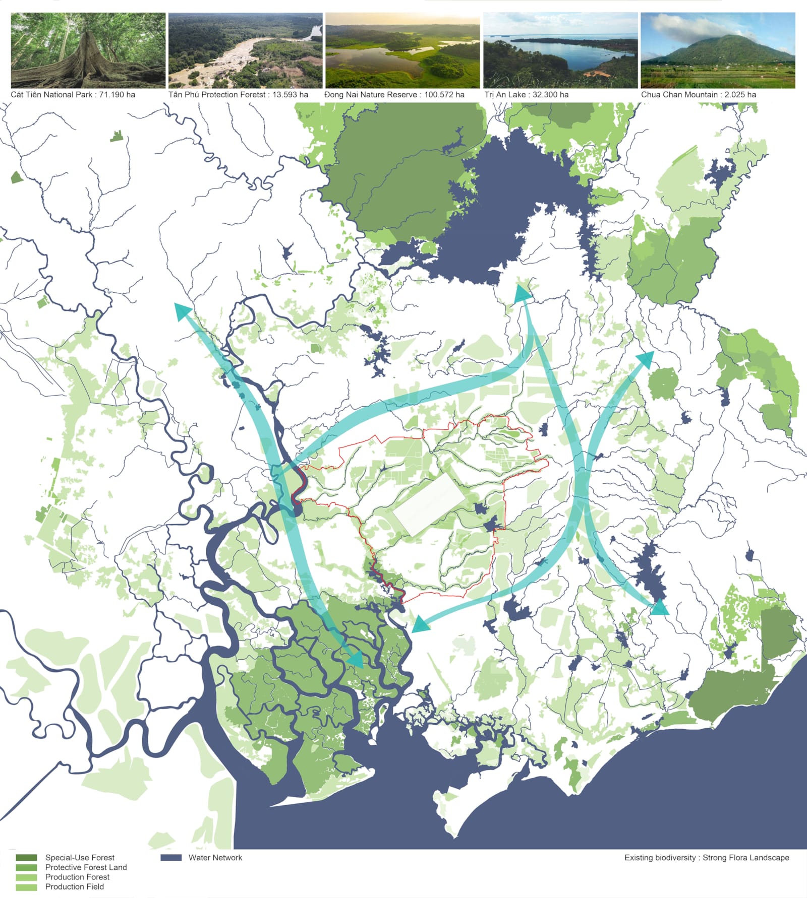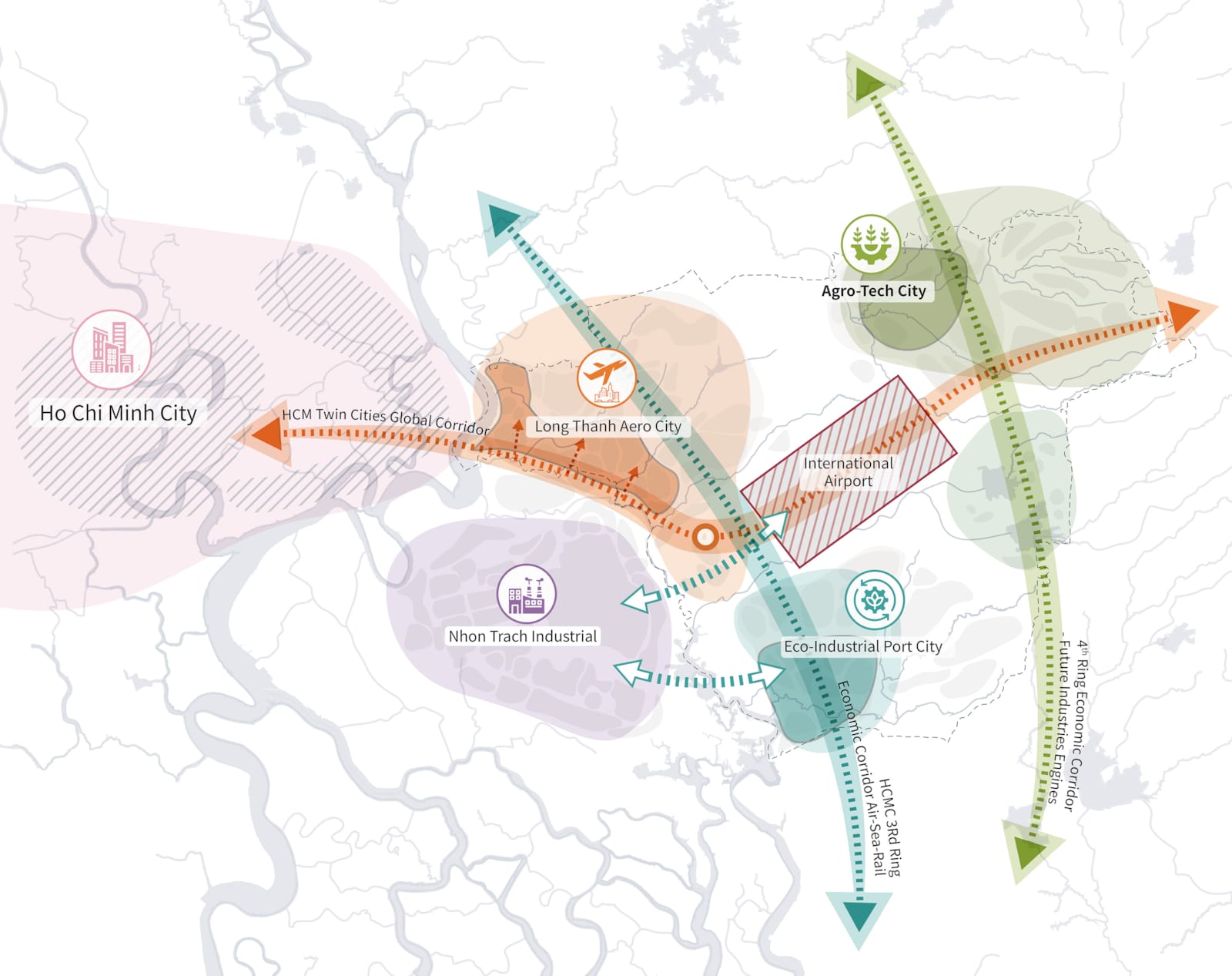The project represents a significant shift in urban planning for the greater Ho Chi Minh region, integrating airport infrastructure with economic development, sustainable mobility and environmental resilience. it is therefore both innovative and experimental within Vietnam. Situated within the country’s expanding economic corridor, the project leverages Long Thanh International Airport as a major driver for regional and global connectivity. It is projected to handle 100 million passengers and 5 million tons of cargo annually, positioning it as a key air hub for the Asia-Pacific region. Around, the aerotropolis establishes a frame-work for growth that balances economic activity with environmental considerations, creating an urban system that is adaptable, efficient, and sustainable.