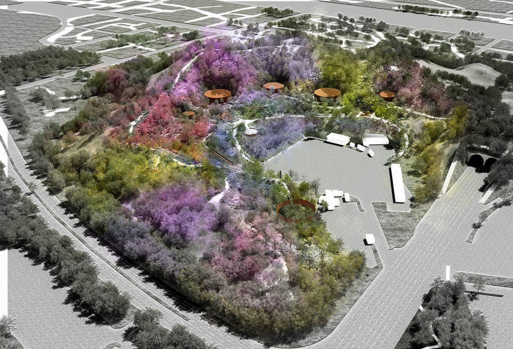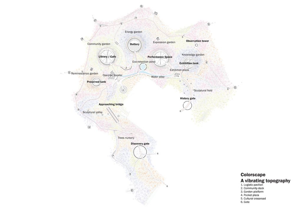 The landscape’s contours have been respected and multiple cultural activities are enjoyed by the assimilation of five tanks in the mountain like park. These generic oil tanks help to structure the site and give the project a unique and strong identity. They reconnect the site to the city and then the site within itself. The containers are camouflaged to fit seamlessly within the site, blurring boundaries between nature, tanks and visitors. They are not the final destination but rather interactive points along visitor paths; they act as stations for exploration that are integrated into a bigger network involving the entire mountain from end to end
