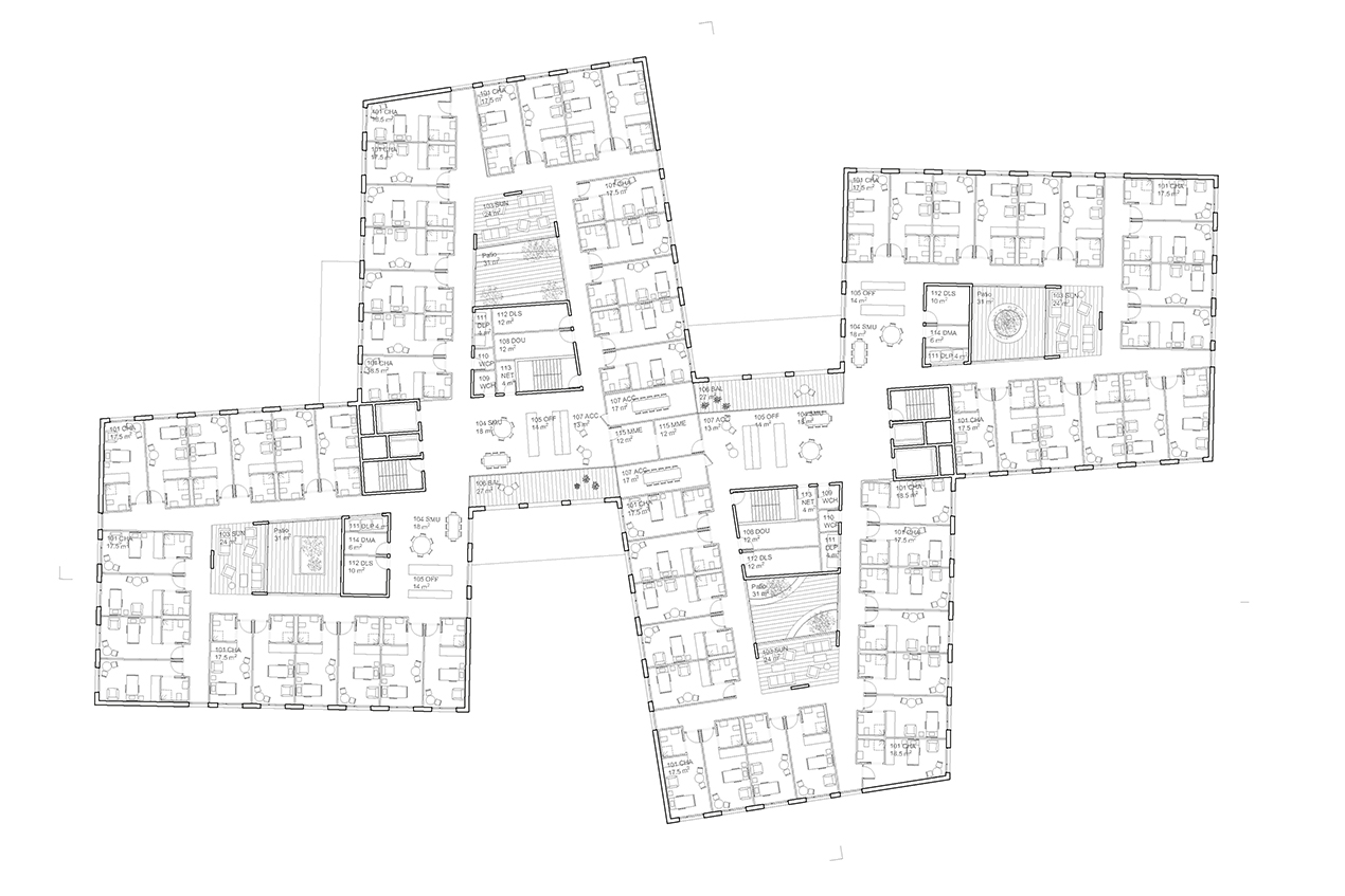 The open courtyards, on either side of the residence, controlled and protected as outdoor spaces, are essential parts of the project, just as important as the residence, its alter ego. Set to the north and the south, these courtyards can be read as a continuation of the park, creating a specific and privileged relationship with the surrounding nature. The four “houses” making up the residence emphasize the articulation with this outdoor space.