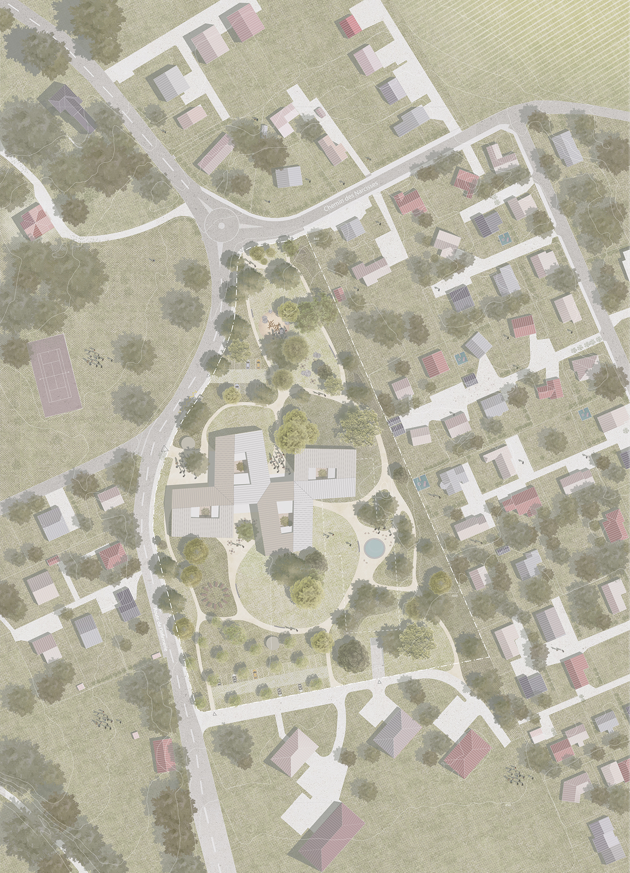 The roof slopes to encourage a relationship with the surrounding villages and gives the residence the scale of the hamlet, an intermediate scale between villa and village. The layout of the building fits finely into the heart of this park around which radiates a network of cells that accommodate different flora environments: the meadow, the vegetable garden, the orchard, the pond, the forecourt and the games. The park’s various programs resonate easily with those installed on the ground floor.