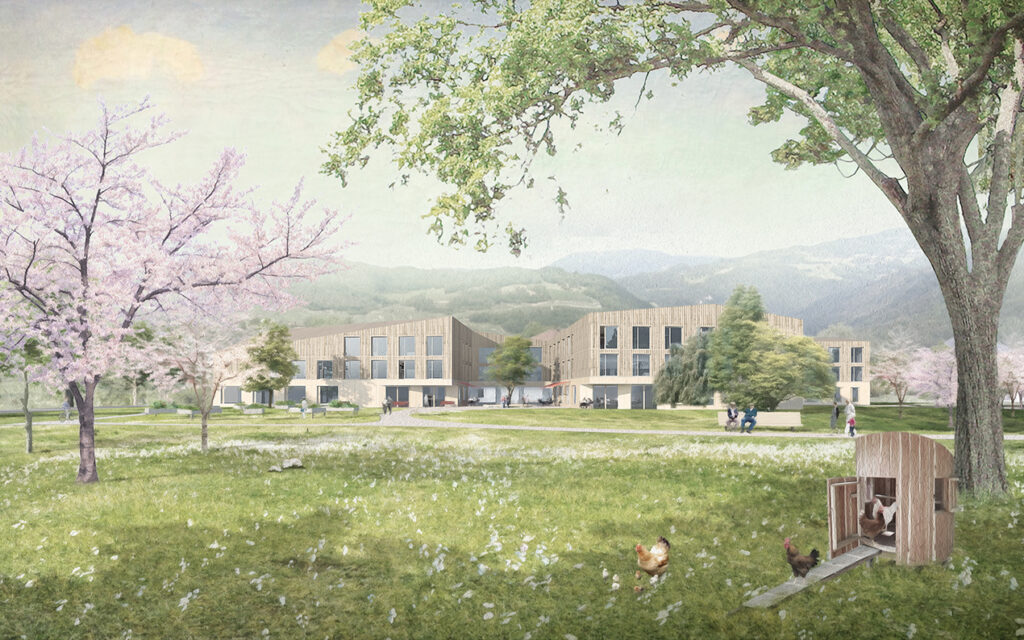 The EMS of the Grande Fontaine Park benefits from the qualities of the surrounding area, a magnificent site to the east of the village of Bex, Switzerland. Dialoguing with the mountain landscape context, the residence and its park complement each other with four interlocking houses clad in wood, evoking both the universes of the park