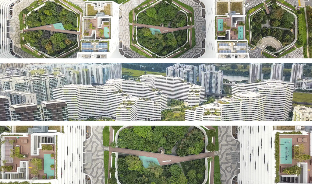 This visual survey celebrates the city as a hypothetic final destination, and reflects on the architectural proposition Singapore was able to produce during its period of rapid industrialization and urbanization following the declaration of independence in 1965. Ever since, the built and the natural environment have been high on Singapore’s agenda and the vision for its built environment has evolved from a ‘Garden City’ to a ‘City in a Garden’ and now a ‘City in Nature’. Within this framework, architects working in the city-state have proposed various visionary designs from the mini-city prototype of Golden Miles to a reflection on artificial landscape architecture with Punggol Waterway Terraces. Of specific importance is how architectural and urban designers in Singapore, often with strong international influences, have tempered, adapted, and transformed their work in order to adhere to the socio-cultural, economic, climatic and political conditions of the cityscape.