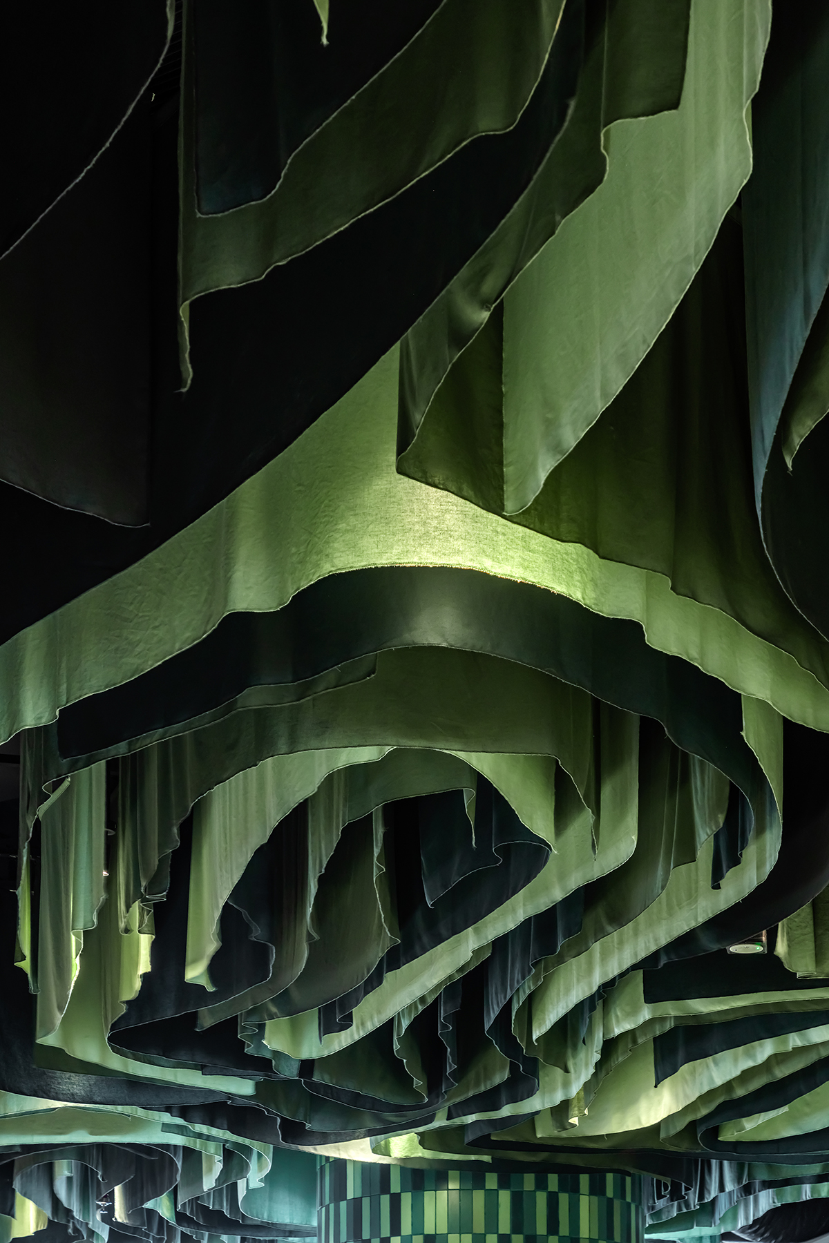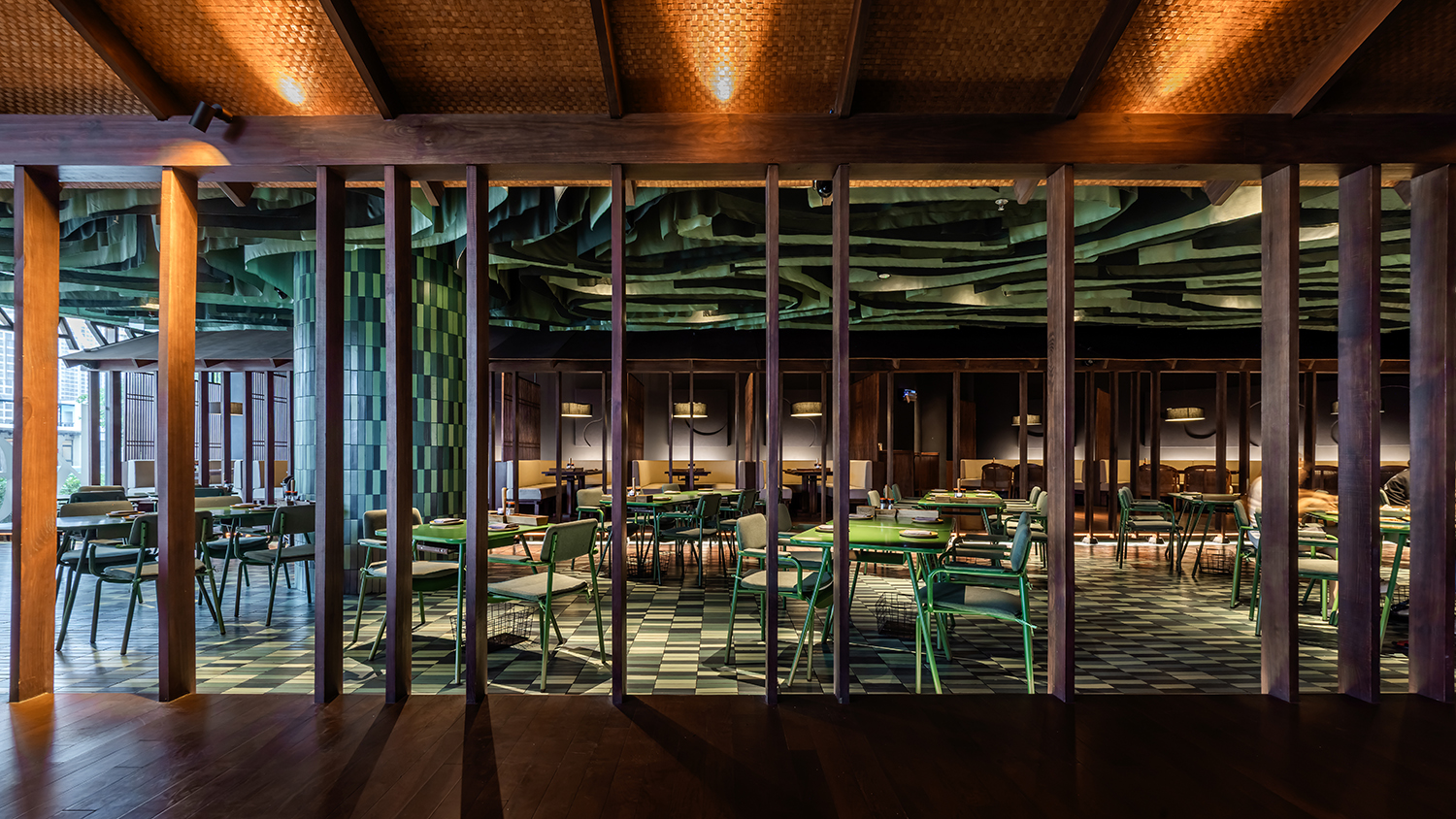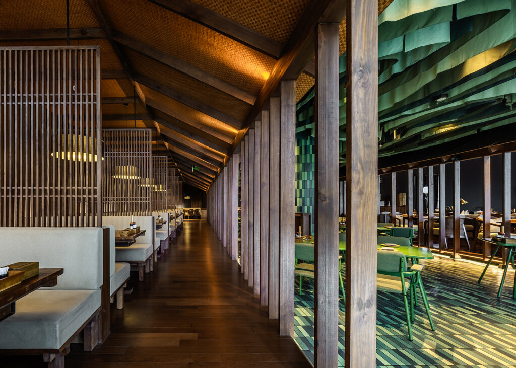 At the heart of the restaurant lies a verdant oasis, where lush green tiles and furnishings create a serene haven. Suspended from the ceiling, delicate green fabrics trace sinuous curves, infusing the space with an ethereal botanical allure.