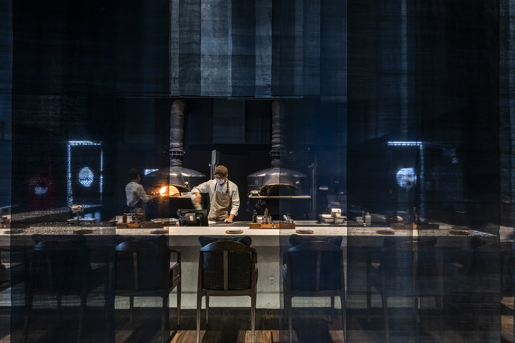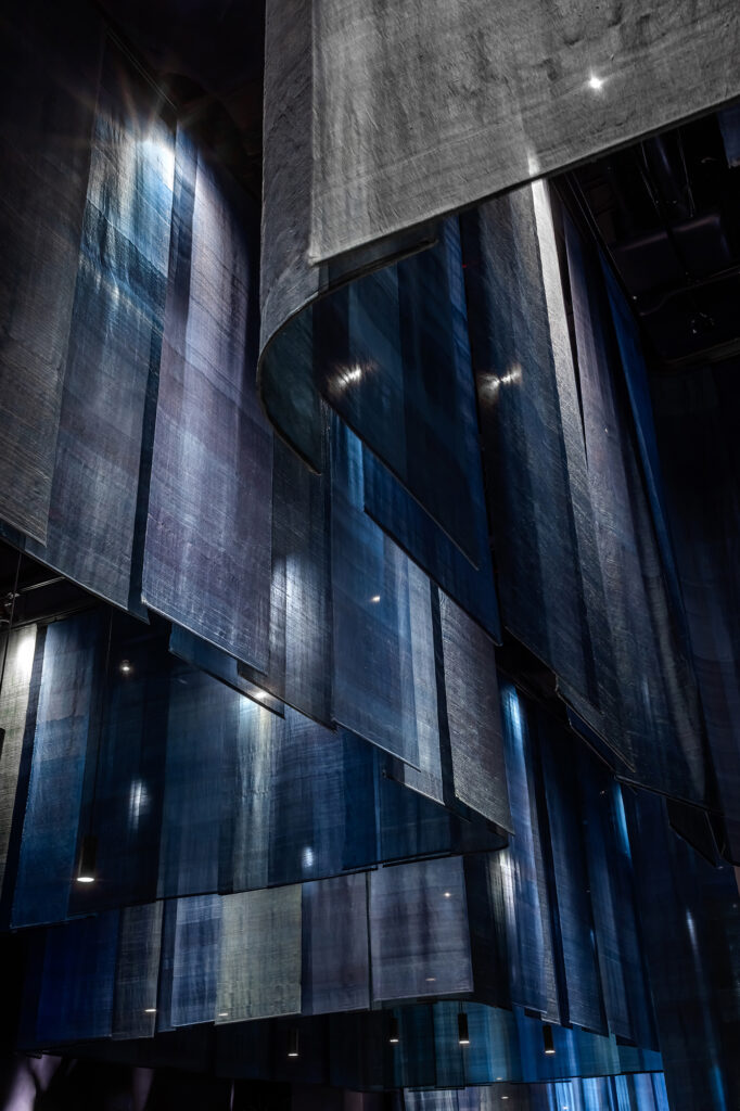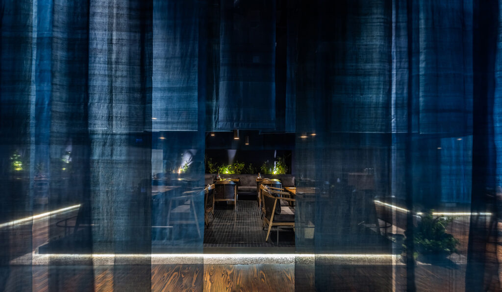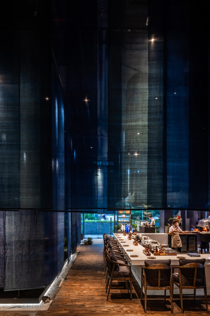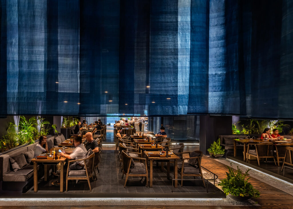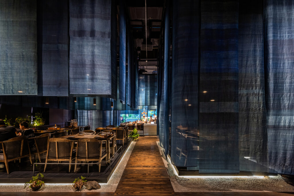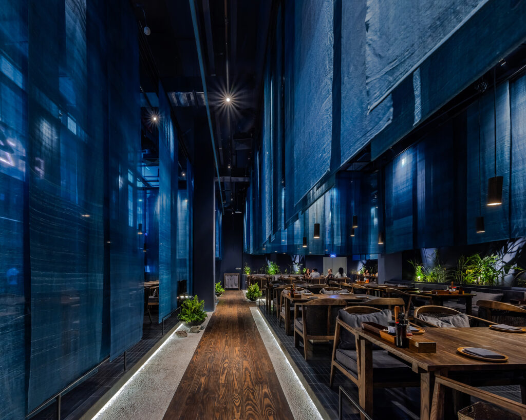 The restaurant’s spatial arrangement is a masterstroke in spatial choreography. Suspended blue fabrics delineate dining areas, orchestrating a symphony of spatial gradients that oscillate between privacy and openness. These fabrics not only mimic the undulating waves of the water but also evoke the ephemeral quality of traditional floating dwellings.