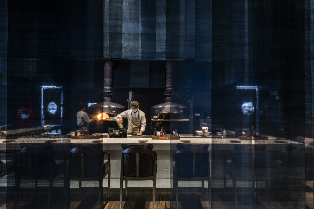 G8A Architects’ interior design project for a 4P’s restaurant in Vietnam embodies the theme of “Pizza through Vietnamese Heritage”, one of the three of the serie, and unveils a sophisticated exploration of traditional floating habitats. The restaurant’s spatial arrangement is a masterstroke in spatial choreography. Suspended blue fabrics delineate dining areas, orchestrating a symphony of