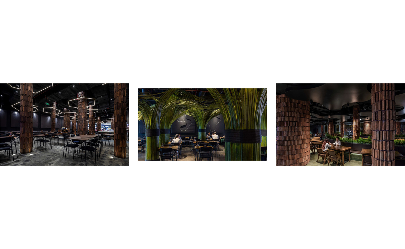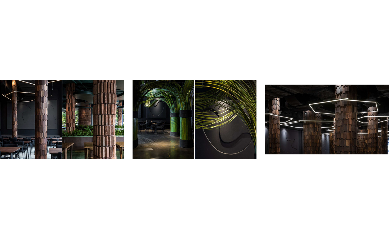 G8A’s ‘Eat a Pizza in a Forest’ series for the famous Pizza 4ps group proposes a mystical experience, transplanting an eerie forest ambiance into the stark mall context. By transporting the user into a highly organic and tactile space, the project questions the artificiality of these shopping environments. The open plan is segmented by a variety of columns crafted of recycled materials. These column “trees” reintroduce curved and imprecise movements, common in natural environments, into the dense and consumerist space.