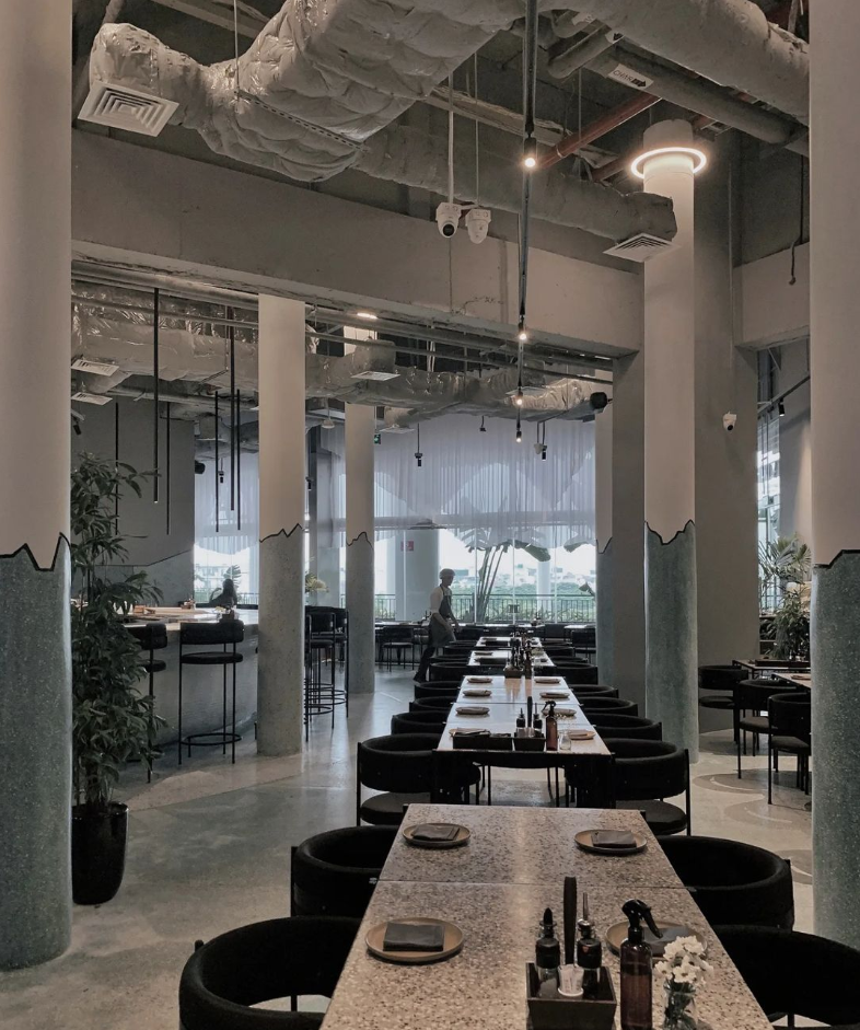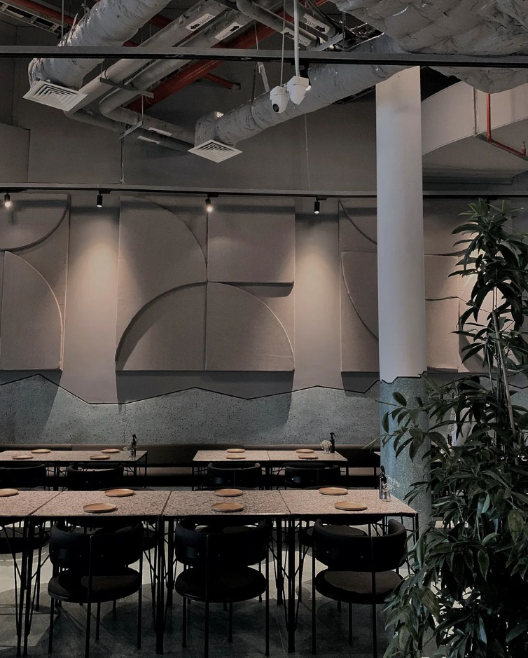 Throughout the space, the materiality evokes the rugged elegance of ancient stones, with hues ranging from soft limestone to the deep, earthy tones of slate. From the floor beneath their feet to the banquettes against the walls, every surface exudes a sense of timelessness and sophistication.