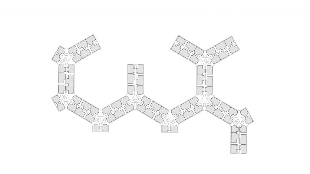 A continuous no-dead-end corridor runs the length of every floor in each of the two sectors, and by virtue of an ingenious planning manoeuvre, the double-loaded corridors actually facilitate cross-ventilation and vertical cooling, instead of blocking the airflow to the apartments. Due to the hexagonal block plans, three corridors are angled at 120 degrees from the lift cores to serve apartments grouped in threes. Each apartment is directly ventilated by the lift-core breezeways and by voids inserted between the groupings.