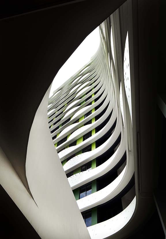 Set upon linked hexagonal plans, the ‘arms’ of the blocks step down to the waterway as terraces, so all the residents have a direct experiential connection with the landscape and with their neighbourhood. The apartments are shielded from the heat and the rain by undulating ribbons of ‘Juliet’ balconies, which perform as decorative sun-shading devices.