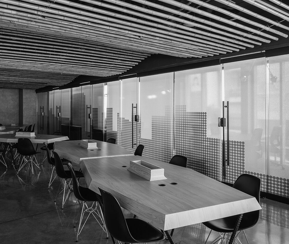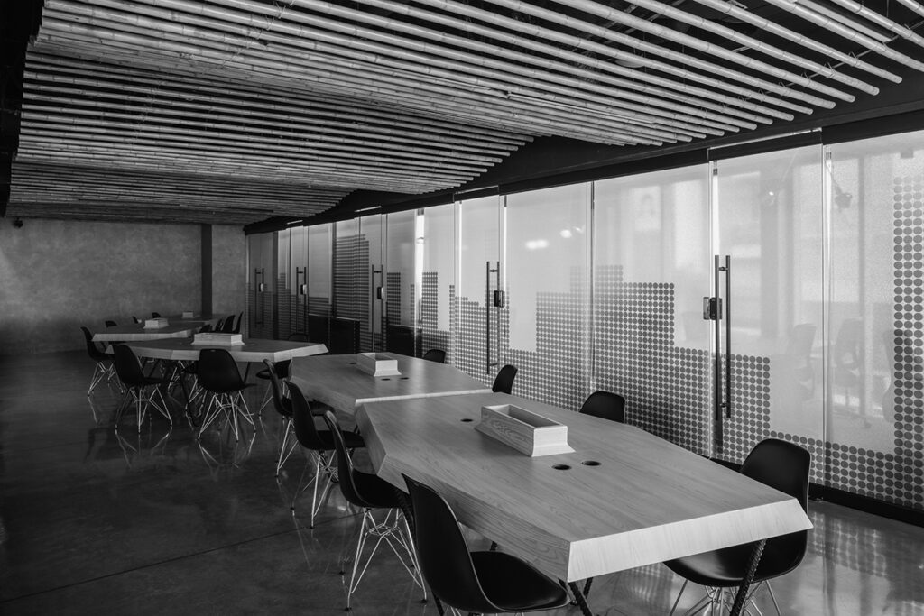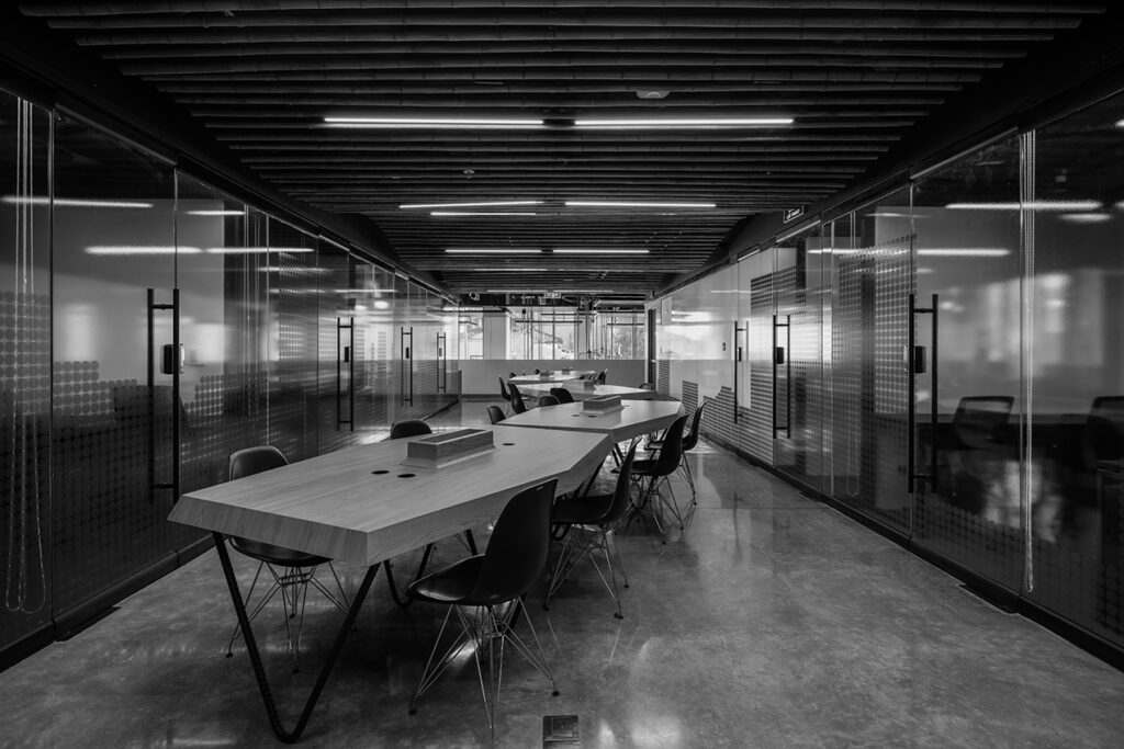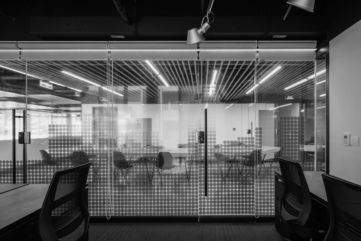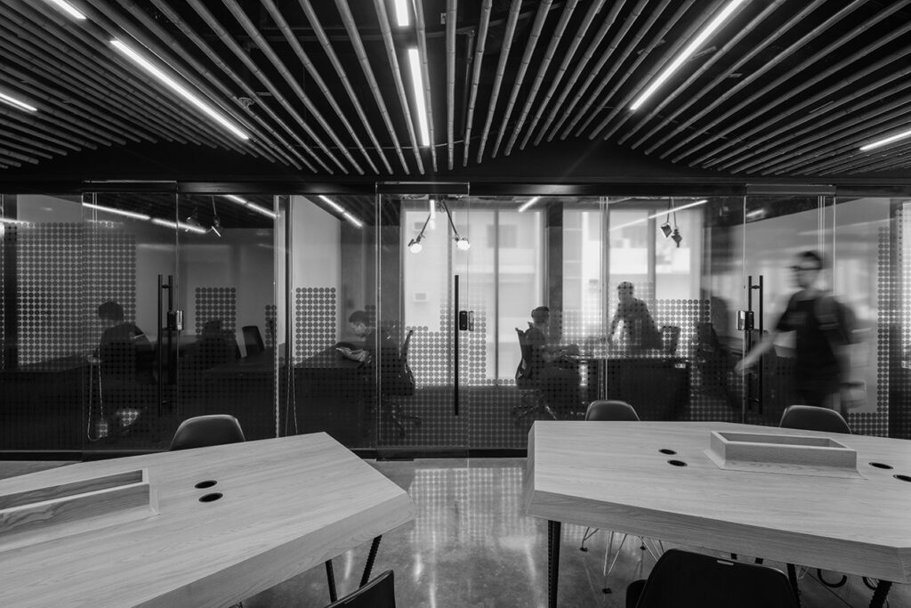 With a neutral spatial distribution that places private working zones towards the exterior of the plan, a central area is liberated to allow a platform for group work, meetings and social connection. This middle partition brings the surrounding urban context directly into the project, the surrounding streetscape abstracted and placed on the dividing walls.