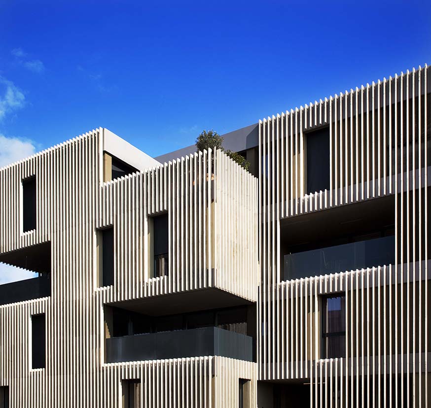 G8A confronts the high density problem by questioning the treatment of the facades. The travertine stone is installed vertically on the facades in regular fences, like sun shading that would be installed at 90°. This mineral grid constitutes an optimal solution which guarantees intimacy to all users while protecting lateral views from outside and maintaining natural light towards the inside. The perception of the walker generates a kind of kinetic game: sometimes seen frontally, the facade appears open and transparent, moving laterally it gets closer and closer to finally appear as a full mineral wall. These vertical fences reflect some of the old village farms, whose front facades are often covered with vertical wooden elements.