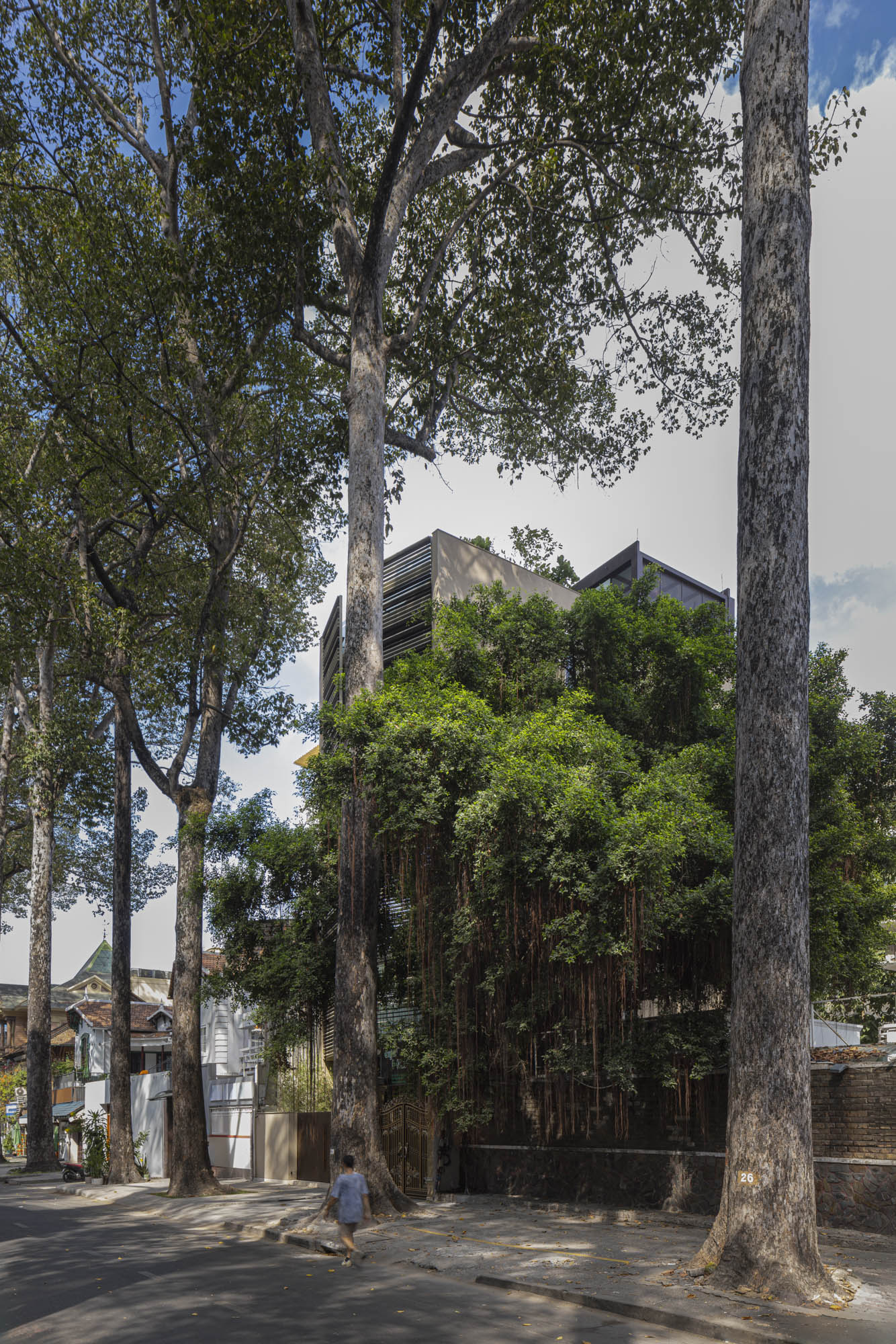 The Gate House has been designed as tribute to a magnificent “dipterocarpus alatus” tree (cây dầu rái), a cherished heritage species deeply intertwined with the memories of Saigonese. Many central streets of Ho Chi Minh City are adorned with these towering dipterocarpus trees, which are highly recognizable due to their mottled beige bark, the extremely