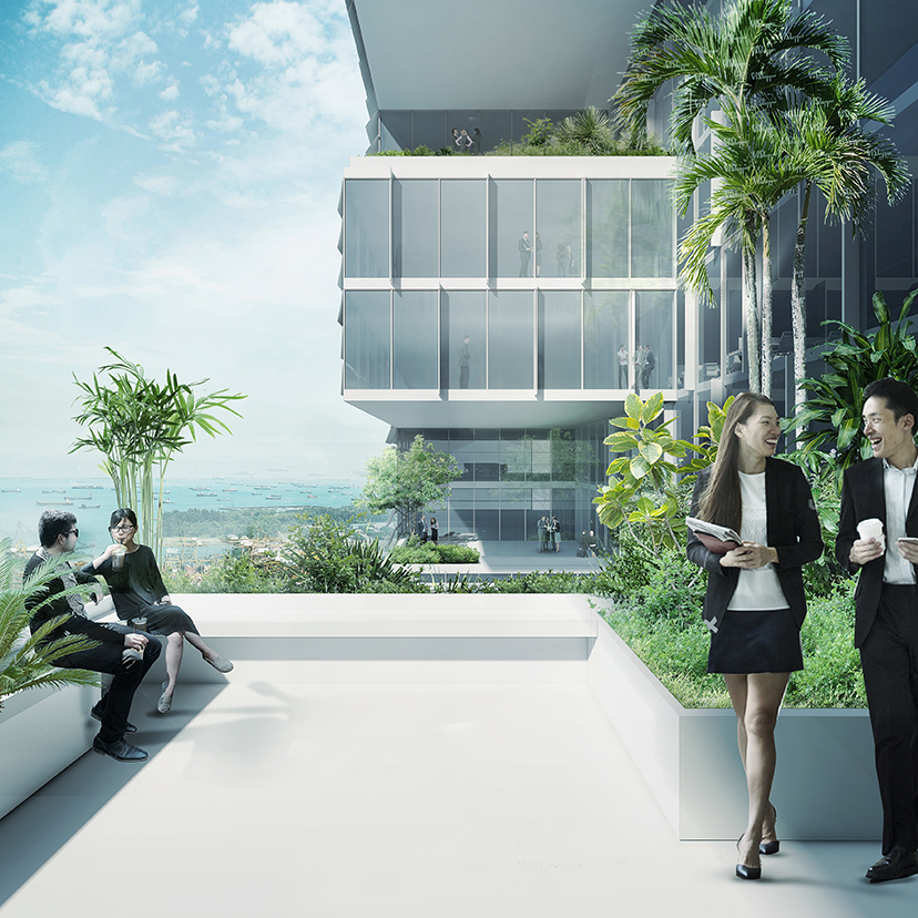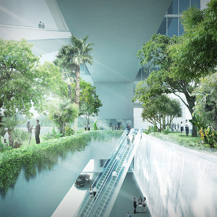 The themes of Work, Learn and Play are organised around the tropical atrium, this pivotal design is a social connecter, enjoying beautiful community spaces. Social sustainability is beneficial to the ambiance of the development. Breaking through typical corporate expectations, the building focuses on the human-scale and links areas by mechanical staircases. These pedestrian promenades allow multiple visual treats and interlink play spaces on each floor integrated into hanging gardens.