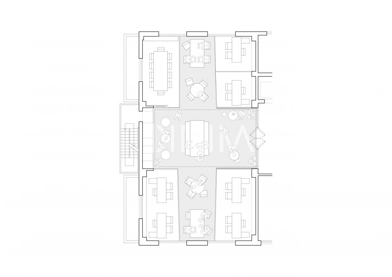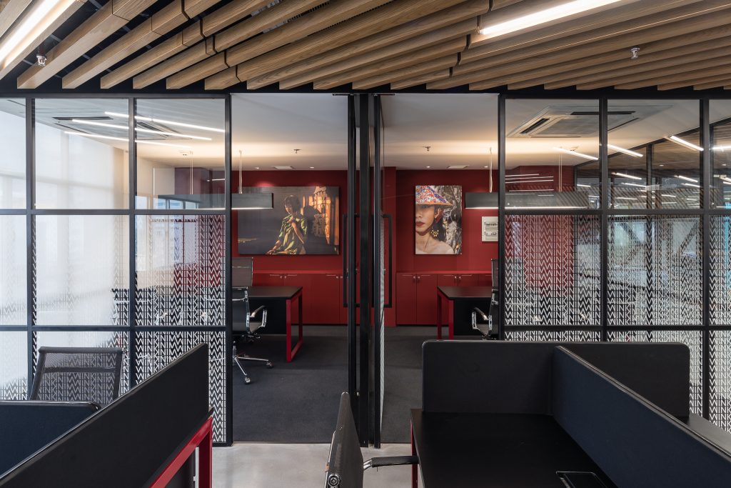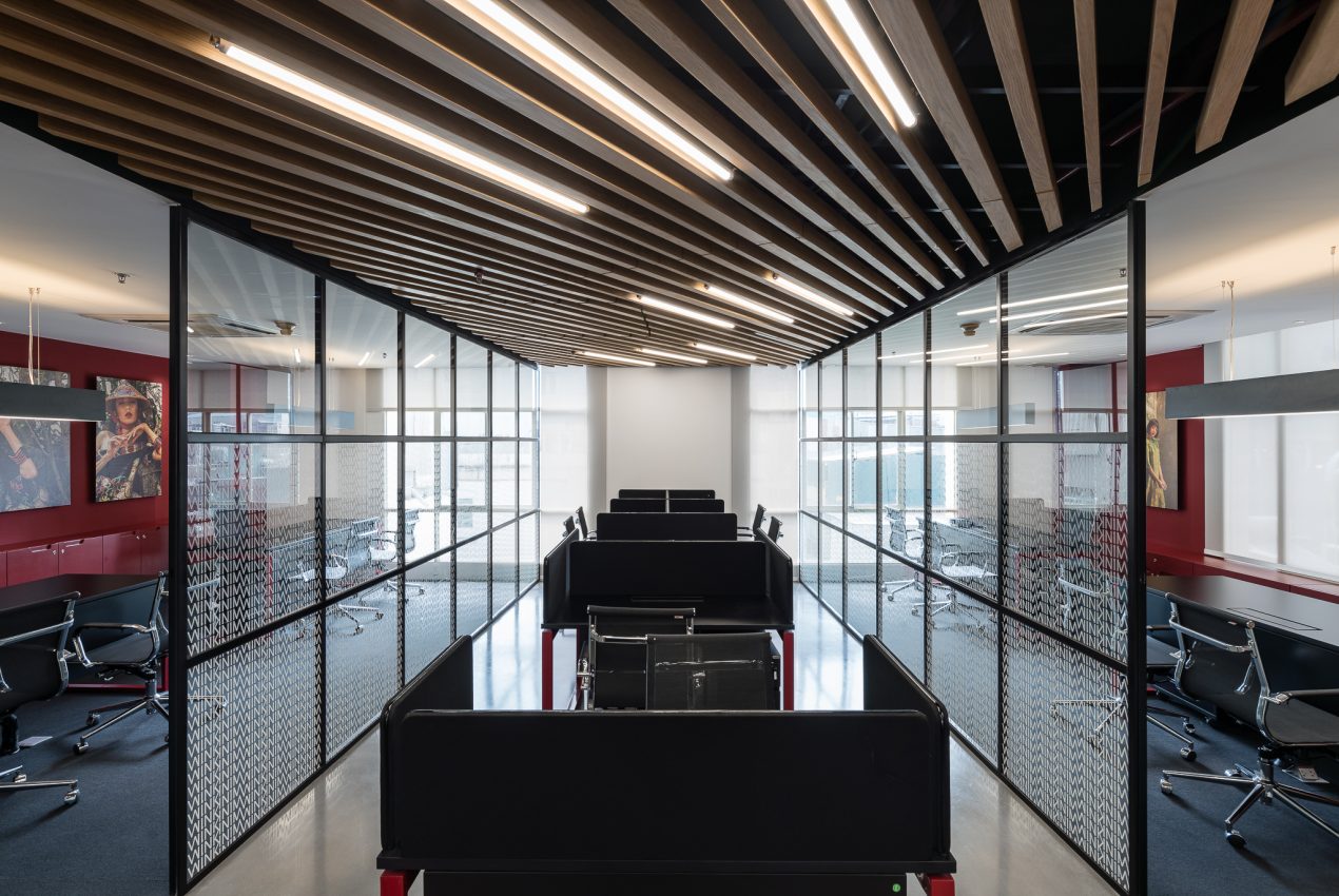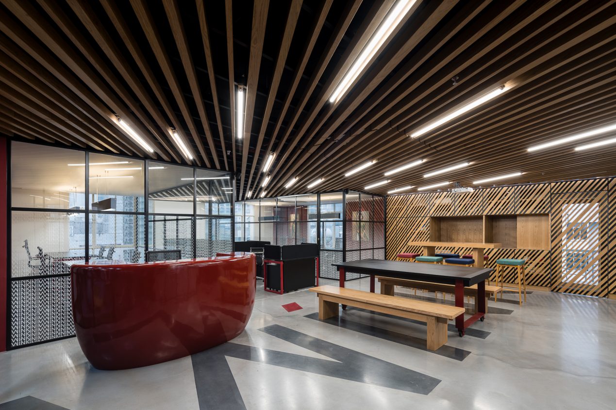 The office space was to be efficient yet creative, and highly flexible in order to accommodate a range of activities from group meetings, workshops, social events and individual work-times. With enclosed meeting spaces placed in each four corners of the site, the central open-cross space holds the majority of the office’s activities. With a warm wooden ceiling and a muted red reinterpretation of the brands’ color scheme, the inclusive design also allows for an abundance of natural light to fill the area, creating a relaxed and casual atmosphere for the workers and guests.